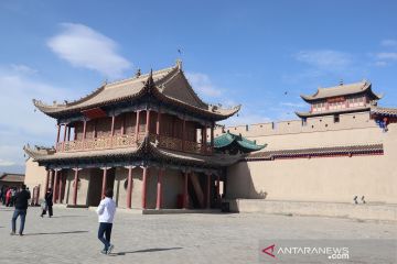 Sejumlah wisatawan berjalan menuju gerbang utama dari Tembok Besar China di Kota Jiayuguan, Provinsi Gansu, China, Senin (7/6/2021). Tembok yang dibangun oleh Dinasti Ming pada tahun 1372 tersebut merupakan benteng pertahanan militer terkuat yang pernah dimilliki China pada saat itu untuk menangkal serangan dari Mongolia. ANTARA FOTO/M. Irfan Ilmie/rwa.