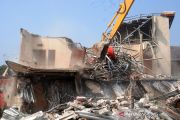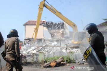 Bangunan kontrakan dibongkar dengan alat berat di Perumahan Dramaga Pratama, Desa Cibadak, Ciampea, Kabupaten Bogor, Jawa Barat, Rabu (9/6/2021). Satpol PP Kabupaten Bogor membongkar bangunan kontrakan empat lantai tersebut karena tidak memiliki Izin Mendirikan Bangunan (IMB) dan berdiri di lahan fasilitas sosial dan umum milik perumahan tersebut. ANTARA FOTO/Arif Firmansyah/rwa.