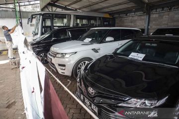 Petugas beraktivitas di dekat kendaraan sitaan milik tersangka kasus dugaan korupsi PT ASABRI (Persero) di Kantor Pusat PT ASABRI (Persero), Cawang, Jakarta, Sabtu (12/6/2021). Kejaksaan Agung melelang 16 mobil kelas menengah hingga mewah hasil sitaan terkait kasus dugaan korupsi PT ASABRI (Persero) yang akan dilakukan pada 15 Juni 2021 pukul 09.00-11.00 WIB pada laman www.lelang.go.id. ANTARA FOTO/Aprillio Akbar/rwa.