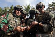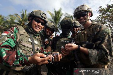 Prajurit Batalyon Intai Amfibi (Yontaifib) Korps Marinir TNI AL bersama United States Marines Corps Reconnaissance Unit menunjukan tukik (anak penyu) yang akan dilepasliarkan di pantai Lampon pada penutupan latihan yang bersandi Reconex 21-II di Pusat Latihan Pertempuran Marinir (Puslatpurmar) 7 Lampon, Banyuwangi, Jawa Timur, Rabu (16/6/2021). Penutupan latihan bersama Reconex21-II itu ditandai dengan pelepasliaran tukik sebagai upaya menjaga kelestarian penyu yang terancam punah. ANTARA FOTO/Budi Candra Setya/aww.
