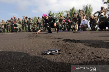 Prajurit Batalyon Intai Amfibi (Yontaifib) Korps Marinir TNI AL melepas tukik (anak penyu) di pantai Lampon pada penutupan latihan yang bersandi Reconex 21-II di Pusat Latihan Pertempuran Marinir (Puslatpurmar) 7 Lampon, Banyuwangi, Jawa Timur, Rabu (16/6/2021). Penutupan latihan bersama Reconex21-II itu ditandai dengan pelepasliaran tukik sebagai upaya menjaga kelestarian penyu yang terancam punah. ANTARA FOTO/Budi Candra Setya/aww.