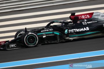 Pebalap tim Mercedes Lewis Hamilton memacu mobilnya dalam sesi latihan ajang balap F1 GP Prancis di Circuit Paul Ricard, Le Castellet, Prancis, Jumat (18/6/2021). ANTARA FOTO/REUTERS/Yves Herman/foc.