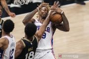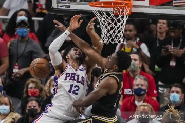 Pebasket Philadelphia 76ers Tobias Harris (12) berebut bola dengan pebasket Atlanta Hawks Onyeka Okongwu (17) pada pertandingan semifinal wilayah timur di State Farm Arena, Atlanta, Georgia, Sabtu (19/6/2021). 76ers memenangi pertandingan dengan skor 104-99 sehingga menyamakan kedudukan 3-3. ANTARA FOT0/USA TODAY Sports/Dale Zanine/pras.