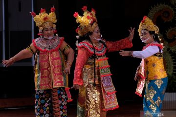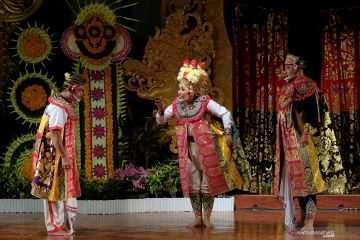 Seniman dari Komunitas Seni Keluarga Kesenian Bali Radio Republik Indonesia menampilkan kesenian arja klasik berjudul "pasah nemu kajeng" dalam pagelaran Pesta Kesenian Bali ke-43 di Taman Budaya Bali, Denpasar, Bali, Minggu (20/6/2021). Pagelaran tersebut digelar untuk melestarikan kesenian arja klasik atau opera khas Bali agar tidak punah seiring berkembangnya kesenian modern. ANTARA FOTO/Nyoman Hendra Wibowo/hp.