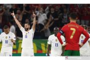 Pesepak bola Prancis Karim Benzema (kedua kiri) melakukan selebrasi setelah mencetak gol ke gawang Portugal dalam laga Group F Euro 2020, di Stadion Puskas Arena, Budapest, Hongaria, Rabu (23/6/2021). Portugal berhasil lolos ke babak 16 besar dengan predikat sebagai peringkat ketiga terbaik group setelah bermain imbang dengan Prancis yang keluar sebagai juara group. ANTARA FOTO/Pool via Reuters-FRANCK FIFE/hp.