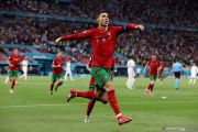 Pesepak bola Portugal Cristiano Ronaldo melakukan selebrasi setelah mencetak gol ke gawang Prancis dalam laga Group F Euro 2020, di Stadion Puskas Arena, Budapest, Hongaria, Rabu (23/6/2021). Portugal berhasil lolos ke babak 16 besar dengan predikat sebagai peringkat ketiga terbaik group setelah bermain imbang dengan Prancis yang keluar sebagai juara group. ANTARA FOTO/Pool via Reuters-BERNADETT SZABO/hp.
