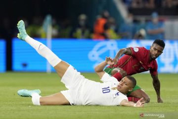 Pesepak bola Prancis Kylian Mbappe berebut bola dengan pesepak bola Portugal Nelson Semedo (kanan) dalam laga Group F Euro 2020, di Stadion Puskas Arena, Budapest, Hongaria, Rabu (23/6/2021). Portugal berhasil lolos ke babak 16 besar dengan predikat sebagai peringkat ketiga terbaik group setelah bermain imbang dengan Prancis yang keluar sebagai juara group. ANTARA FOTO/Pool via Reuters-DARKO BANDIC/hp.