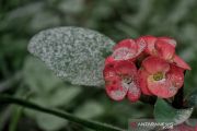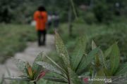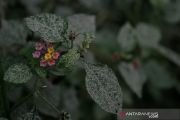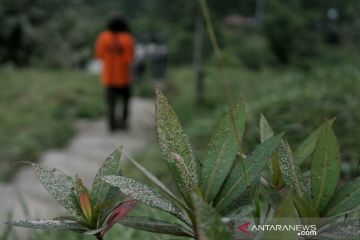 Material abu vulkanik pascaerupsi Gunung Merapi menempel pada tumbuhan di kawasan Bukit Klangon, Cangkringan, Sleman, D.I Yogyakarta, Jumat (25/6/2021). Berdasarkan laporan PUSDALOPS BPBD KABUPATEN SLEMAN, sejumlah daerah di wilayah Cangkringan, Sleman mengalami hujan abu vulkanik usai terjadinya awan panas guguran Gunung Merapi pada Jumat (25/6) pagi. ANTARA FOTO/Andreas Fitri Atmoko/hp.