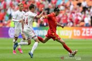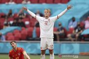 Pemain Denmark Kasper Dolberg membobol gawang Wales pada pertandingan babak 16 besar Kejuaraan Piala Eropa 2020 di Johan Cruijff ArenA, Amsterdam, Belanda, Sabtu (26/6/2021). Hingga berakhir babak pertama, Denmark unggul 1-0 atas Wales. ANTARA FOTO/Kenzo Tribouillard/Pool via REUTERS/wsj.