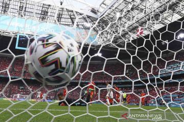 Pemain Denmark Kasper Dolberg membobol gawang Wales pada pertandingan babak 16 besar Kejuaraan Piala Eropa 2020 di Johan Cruijff ArenA, Amsterdam, Belanda, Sabtu (26/6/2021). Hingga berakhir babak pertama, Denmark unggul 1-0 atas Wales. ANTARA FOTO/REUTERS/Piroschka Van De Wouw/wsj.