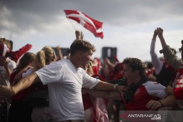 Para pendukung timnas Denmark melakukan selebrasi usai timnya berhasil membobol gawang Wales pada pertandingan babak 16 besar Kejuaraan Piala Eropa 2020 di Johan Cruijff ArenA, Amsterdam, Belanda, Sabtu (26/6/2021). Hingga berakhir babak pertama, Denmark unggul 1-0 atas Wales. ANTARA FOTO/REUTERS/Hannah Mckay/wsj.