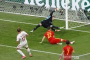 Pemain Denmark Kasper Dolberg (kiri) membobol gawang Wales pada pertandingan babak 16 Besar Kejuaraan Piala Eropa 2020 di Johan Cruijff ArenA, Amsterdam, Belanda, Sabtu (26/6/2021). Lumat Wales 4-0, Denmark melenggang ke babak perempat final Euro 2020. ANTARA FOTO/Koen Van Weel/Pool via REUTERS/wsj.