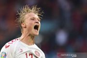 Pemain Denmark Kasper Dolberg melakukan selebrasi usai membobol gawang Wales pada pertandingan babak 16 Besar Kejuaraan Piala Eropa 2020 di Johan Cruijff ArenA, Amsterdam, Belanda, Sabtu (26/6/2021). Lumat Wales 4-0, Denmark melenggang ke babak perempat final Euro 2020. ANTARA FOTO/Olaf Kraak/Pool via REUTERS/wsj.
