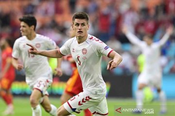 Pemain Denmark Joakim Maehle (kanan) melakukan selebrasi usai membobol gawang Wales pada pertandingan babak 16 Besar Kejuaraan Piala Eropa 2020 di Johan Cruijff ArenA, Amsterdam, Belanda, Sabtu (26/6/2021). Lumat Wales 4-0, Denmark melenggang ke babak perempat final Euro 2020. ANTARA FOTO/Olaf Kraak/Pool via REUTERS/wsj.