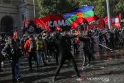 Demonstran berunjuk rasa ketika anggota majelis konstitusi mengadakan sesi pertama untuk merancang konstitusi baru, di Santiago, Chili (4/7/2021). ANTARA FOTO/REUTERS/Pablo Sanhueza/aww.