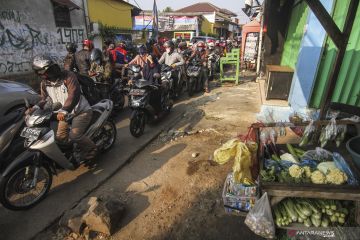 Kepadatan kendaraan yang terjadi di jalur alternatif perbatasan Depok dan Jakarta di Jalan Setu Pedongkelan, Depok, Jawa Barat, Senin (5/7/2021). Kepadatan tersebut karena pengendara memilih melintasi jalur alternatif atau jalur tikus imbas dari penyekatan PPKM Darurat di Jalan Raya Bogor. ANTARA FOTO/Asprilla Dwi Adha/foc.