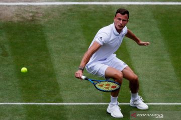 Petenis Hongaria Marton Fucsovics mengembalikan bola ke arah lawannya petenis Serbia Novak Djokovic dalam laga perempat final Turnamen Tenis Wimbledon, di All England Lawn Tennis and Croquet Club, London, Inggris, Rabu (7/7/2021). Djokovic melaju ke babak semi final settelah mengalahkan Fucsovics straight set (6-3, 6-4, dan 6-4). ANTARA FOTO/Reuters-Paul Childs/hp.