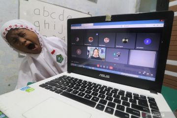 Siswi kelas satu Madrasah Ibtidaiyah Negeri 2 Kediri mengikuti masa pengenalan sekolah secara daring di rumahnya di Kediri, Jawa Timur, Senin (12/7/2021). Hari pertama sekolah tahun ajaran baru di sekolah tersebut dilakukan secara daring seiring penerapan Pemberlakuan Pembatasan Kegiatan Masyarakat (PPKM) Darurat guna menghindari penyebaran COVID-19. ANTARA FOTO/Prasetia Fauzani/hp.
