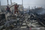 Petugas memadamkan sisa api yang membakar perkampungan padat penduduk di Jalan Lindung Pasar Baru, Teluk Gong, Jakarta Utara, Sabtu (17/7/2021). Kebakaran yang belum bisa dipastikan pemicunya itu menghanguskan ratusan rumah dan menyebabkan sekitar 600 warga kehilangan tempat tinggalnya. ANTARA FOTO/Aditya Pradana Putra/pras.