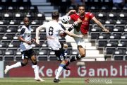 Pemain Manchester United Mason Greenwood (kanan) berebut bola dengan pemain Derby County Max Bird dalam laga persahabatan pramusim di Pride Park, Derby, Inggris, Minggu (18/7/2021). MU menang 2-1 dalam laga tersebut. ANTARA FOTO/Reuters/Action Images via Reuters/Craig Brough/foc.