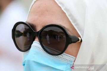 Peziarah Muslim tercermin dalam kacamata seorang wanita di dataran Arafat selama ziarah haji tahunan di luar kota suci Mekkah, Arab Saudi Senin (19/7/2021). ANTARA FOTO/REUTERS/Ahmed Yosri/rwa.