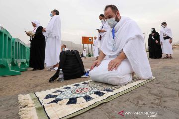 Umat Muslim berdoa di padang Arafah saat menunaikan ibadah haji di luar kota suci Mekkah, Arab Saudi, Senin (19/7/2021). ANTARA FOTO/REUTERS/Ahmed Yosri/rwa.
