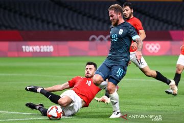 Pemain Argentina Adolfo Gaich melakukan tendangan ke arah gawang Mesir pada pertandingan sepak bola putra Olimpiade Tokyo 2020 Grup C di Sapporo Dome, Sapporo, Jepang, Minggu (25/7/2021). Argentina menang tipis 1-0 atas Mesir melalui gol Facundo Medina. ANTARA FOTO/REUTERS/Kim Hong-Ji/pras.