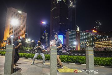 Sejumlah warga dengan mengenakan masker berolahraga di kawasan Bundaran Hotel Indonesia, Jakarta, Minggu (25/7/2021). Presiden Joko Widodo memutuskan untuk memperpanjang Pemberlakuan Pembatasan Kegiatan Masyarakat (PPKM) di sejumlah wilayah Pulau Jawa dan Bali hingga 2 Agustus mendatang. ANTARA FOTO/M Risyal Hidayat/rwa.