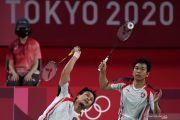 Ganda putra Indonesia Mohammad Ahsan (kiri) dan Hendra Setiawan mengepalkan tangan seusai mengalahkan ganda putra Korea Solgyu Choi dan Seungjae Seo dalam penyisihan Grup D Olimpiade Tokyo 2020 di Musashino Forest Sport Plaza, Tokyo, Jepang, Selasa (27/7/2021). Ahsan dan Hendra berhasil menjadi juara grup D setelah menang 21-12, 19-21, 21-18 atas Solgyu Choi dan Seungjae Seo. ANTARA FOTO/Sigid Kurniawan/wsj.