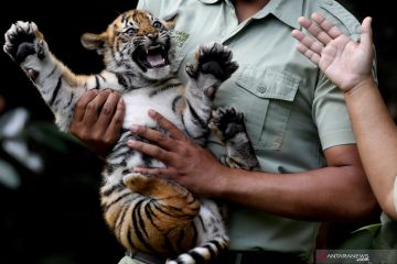 Perawat satwa menggendong bayi Harimau Sumatera (Panthera tigris sumatrae) saat pemberian nama bayi tersebut pada peringatan Hari Harimau Sedunia di Taman Safari Prigen, Pasuruan, Jawa Timur, Kamis (29/7/2021). Dua bayi Harimau Sumatera yang lahir pada 4 Mei 2021 dan berjenis kelamin betina itu diberi nama Isyana dan Aura, dan menambah koleksi Harimau Sumatera di Taman Safari Prigen menjadi empat ekor. ANTARA FOTO/Zabur Karuru/foc.