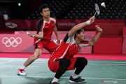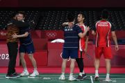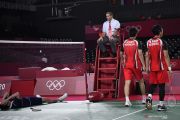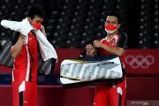 Pebulu tangkis ganda putra Indonesia Mohammad Ahsan/Hendra Setiawan meninggalkan lapangan usai kalah dari ganda putra Malaysia Aaron Chia/Soh Wooi Yik dalam pertandingan perebutan medali perunggu Olimpiade Tokyo 2020 di Musashino Forest Sport Plaza, Tokyo, Jepang, Sabtu (31/7/2021). Mohammad Ahsan/Hendra Setiawan gagal meraih perunggu setelah kalah 21-17, 17-21 dan 14-21. ANTARA FOTO/Sigid Kurniawan/wsj.
