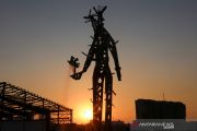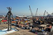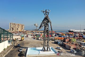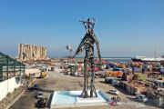 Patung setinggi 25 meter, The Gesture, karya arsitek Lebanon Nadim Karam diresmikan di Pelabuhan Beirut, Lebanon, Senin (2/8/2020). Patung yang terbuat dari puing ledakan Beirut tersebut sebagai bentuk penghormatan pada korban dan mengenang peristiwa yang merenggut 200 jiwa dan melukai ribuan lainnya pada 10 Agustus 2020. ANTARA FOTO/REUTERS/Imad Creidi/foc.