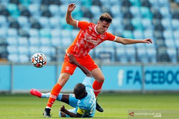 Pesepak bola Manchester City Benjamin Mendy (kiri) berebut bola dengan pesepak bola Blackpool Sky Sinclair dalam laga persahabatan pramusim, di Stadion Manchester City Academy, Manchester, Inggris, Selasa (3/8/2020). Manchester City mengalahkan Blackpool 4-1. ANTARA FOTO/Action Images via Reuters-Lee Smith/hp.