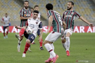 Pesepak bola Cerro Porteno Claudio Aquino (kedua kiri) berupaya melewati penjagaan pemain belakang Fluminense dalam laga leg kedua babak 16 besar Copa Libertadores, di Stadion Maracana, Rio de Janeiro, Brazil, Selasa (3/8/2021). Fluminense melaju ke babak berikutnya setelah mengalahkan Cerro Porteno 1-0 dalam pertadningan ini sehingga unggul agregat 3-0. ANTARA FOTO/Pool via Reuters- Antonio Lacerda/hp.