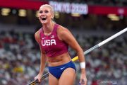 Atlet lompat galah putri Amerika Serikat Katie Nageotte beraksi saat mengikuti babak final nomor lompat galah putri Olimpiade Tokyo 2020, di Stadion Olimpiade, di Tokyo, Jepang, Kamis (5/8/2021). Katie Nageotte berhasil meraih medali emas setelah melewati mistar setinggi 4,90 meter, medali perak di raih atlet Komite Olimpiade Rusia (ROC) Anzhelika Sidorova (4,85 meter), dan medali perunggu diraih atlet Inggris Raya Holly Bradshaw (4,85 meter). ANTARA FOTO/Reuters-Clodagh Kilcoyne/hp.