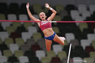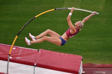 Atlet lompat galah putri Amerika Serikat Katie Nageotte berhasil melewati mistar setinggi 4,90 meter saat mengikuti babak final nomor lompat galah putri Olimpiade Tokyo 2020, di Stadion Olimpiade, di Tokyo, Jepang, Kamis (5/8/2021). Katie Nageotte berhasil meraih medali emas setelah melewati mistar setinggi 4,90 meter, medali perak di raih atlet Komite Olimpiade Rusia (ROC) Anzhelika Sidorova (4,85 meter), dan medali perunggu diraih atlet Inggris Raya Holly Bradshaw (4,85 meter).ANTARA FOTO/Reuters-Dylan Martinez/hp.