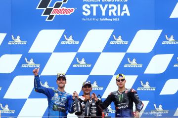 Jorge Martin (tengah) dari Pramac Racing berfoto bersama saat merayakan kemenangannya dalam balapan MotoGP Grand Prix Styrian di podium dengan pemenang kedua Joan Mir dan pemenang ketiga Fabio Quartararo. di, Red Bull Ring, Spielberg, Austria, Minggu (8/8/2021). ANTARA FOTO/Reuters-Borut Zivulovic/hp.