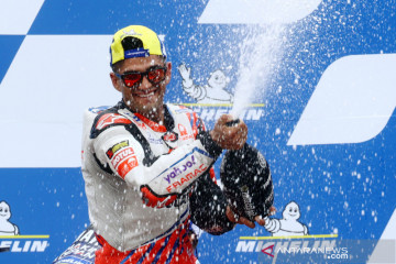 Jorge Martin dari Pramac Racing merayakan kemenangannya dalam balapan MotoGP di podium MotoGP Grand Prix Styrian, Red Bull Ring, Spielberg, Austria, Minggu (8/8/2021). Jorge Martin berhasil menjadi yang tercepat dalam Grand Prix Styrian ini diikuti pembalap Joan Mir dan Fabio Quartararo. ANTARA FOTO/Reuters-Borut Zivulovic/hp.