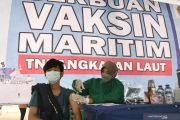 Petugas kesehatan (kanan) menyuntikkan vaksin COVID-19 kepada warga di TPI (Tempat Pelelangan Ikan) Paljaya, Tarumajaya, Kabupaten Bekasi, Jawa Barat, Selasa (10/8/2021). Sebanyak 1.500 warga pesisir mengikuti kegiatan serbuan vaksin maritim TNI-AL dosis kedua guna mencegah penyebaran wabah COVID-19. ANTARA FOTO/ Fakhri Hermansyah/hp.