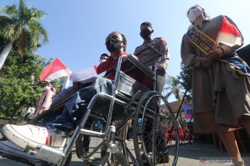 Kasat Lantas AKP Arpan (tengah) mendorong kursi roda penyandang disabilitas untuk mendapatkan suntikan vaksin COVID-19 di Polres Kediri Kota, Kota Kediri, Jawa Timur, Selasa (10/8/2021). Polres Kediri Kota bekerja sama dengan Dinas Sosial melakukan vaksinasi kepada sedikitnya 83 orang penyandang disabilitas. ANTARA FOTO/Prasetia Fauzani/hp.