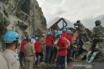 Anggota Pasukan Tanggap Bencana Nasional (NDRF) mencari korban selamat selama operasi penyelamatan di lokasi tanah longsor di distrik Kinnaur, negara bagian utara Himachal Pradesh, India, Rabu (11/8/2021). ANTARA FOTO/NDRF/Handout via REUTERS/rwa.
