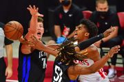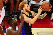 Pebasket Orlando Magic Asbjorn Midtgaard (kiri) berupaya memasukkan bola ke ring lawan dan dihalangi pebasket Houston Rockets Usman Garuba (kanan) dalam laga NBA Summer League, di Thomas & Mack Center, Las Vegas, Nevada, Amerika Serikat, Minggu (15/8/2021). Magic berhasil mengalahkan Rockets 89 - 76. ANTARA FOTO/Reuters-Stephen R. Sylvanie-USA TODAY Sports/hp.