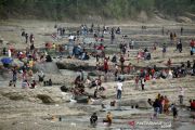Sejumlah warga berwisata di Sungai Cipamingkis yang mengering, Sukamakmur, Kabupaten Bogor, Jawa Barat, Selasa (17/8/2021). Masyarakat memanfaatkan sungai yang mengering itu untuk berwisata saat libur hari Kemerdekaan Indonesia ke-76. ANTARA FOTO/Yulius Satria Wijaya/aww.