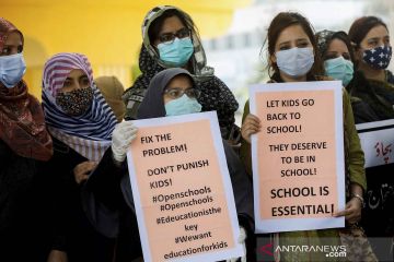 Guru-guru sekolah swasta memegang spanduk selama protes menuntut pembukaan sekolah yang ditutup di tengah pandemi COVID-19 di Karachi, Pakistan, Senin (23/8/2021). ANTARA FOTO/REUTERS/Akhtar Soomro/rwa.