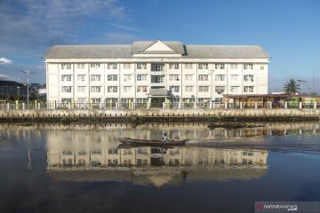 Sebuah perahu bermesin (klotok) melintas di kawasan Rusunawa Teluk Kelayan, Banjarmasin, Kalimantan Selatan, Minggu (29/8/2021). Dirjen Perumahan Kementerian PUPR mencatat realisasi pembangunan rumah susun (rusun) di tahun 2020 hanya mencapai 70,28 persen atau setara 823 unit dari target 1.171 unit, rendahnya capaian itu akibat adanya refocusing anggaran proyek akibat pandemi COVID-19. ANTARA FOTO/Makna Zaezar/rwa.