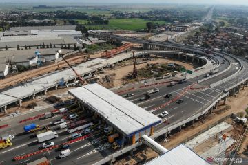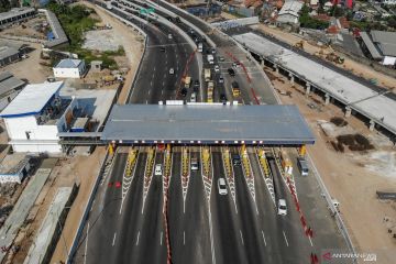 Foto udara kendaraan melintas di gerbang tol Simpang Susun Cileunyi di Kabupaten Bandung, Jawa Barat, Rabu (1/9/2021). PT Jasa Marga (Persero) Tbk mengoperasikan gerbang tol Cileunyi yang baru pada hari ini (1/9/2021) untuk menunjang penyelesaian pembangunan Jalan Tol Cileunyi-Sumedang-Dawuan (Cisumdawu) yang terintegrasi dengan Jalan Tol Padaleunyi. ANTARA FOTO/Raisan Al Farisi/wsj.