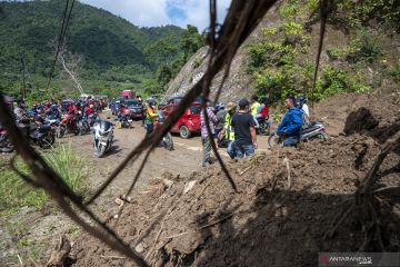 Sejumlah pengendara tertahan di ruas Jalan Trans Palu-Palolo yang tertimbun material longsoran di Desa Sigimpu, Sigi, Sulawesi Tengah, Sabtu (4/9/2021). Jalan yang menghubungkan Kota Palu dan sejumlah kecamatan di Kabupaten Sigi itu tertimbun material longsoran di tujuh titik akibat hujan deras dengan intensitas tinggi pada Jumat (3/9) petang dan sempat memutus total jalan itu selama lebih dari 13 jam. ANTARA FOTO/Basri Marzuki/foc.