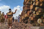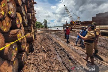 Gubernur Kalimantan Tengah Sugianto Sabran (kanan) melakukan pengecekkan ribuan kayu log milik PT Hutan Produk Lestari di pelabuhan terminal khusus Palangkaraya, Kalimantan Tengah, Senin (6/9/2021). Pemprov Kalteng menyegel sementara ribuan kayu log yang diduga ilegal milik perusahaan tersebut hasil dari penebangan pohon hutan di wilayah Kalteng sebagai upaya mengatasi penebangan pohon secara ilegal yang mengakibatkan bencana banjir. ANTARA FOTO/Arif Hidayat/aww.