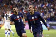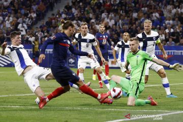 Pesepak bola Prancis Antoine Griezmann (kedua kiri) mencetak gol ke gaeang Finlandia yang di jaga penjaga gawang Lukas Hradecky (kanan) dalam laga Group D Zona Eropa Kualifikasi Piala Dunia 2022, di Stadion Groupama, Lyon, Prancis, Selasa (7/9/2021). Prancis berhasil mengalahkan Finlandia 2-0 dan kedua gol tersebut di cetak oleh Griezmann ANTARA FOTO/Reuters-Stephane Mahe/hp.
