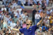 Petenis Rusia Daniil Medvedev merayakan kemenangan usai mengalahkan petenis Serbia Novak Djokovic pada pertandingan final tunggal putra US Open 2021 di USTA Billie Jean King National Tennis Center, New York, Amerika Serikat , Senin (13/9/2021). Daniil Medvedev berhasil juara US Open setelah memang dengan skor 6-4, 6-4, 6-4. ANTARA FOTO/USA TODAY Sports via Reuters/pras.